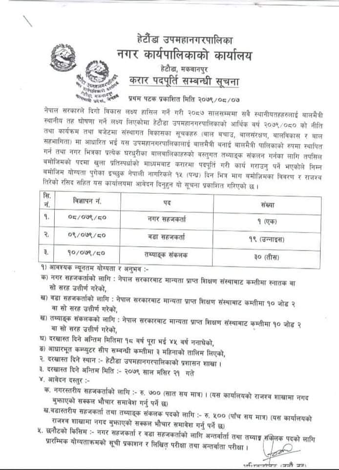 हेटौंडा उपमहानगरपालिकाले एकै पटक बिभीन्न पदमा ५० जना कर्मचारी माग गरेको छ । उपमहानगरपालिकाले करारमा बिभीन्न पदका लागि ५० जना कर्मचारी माग गरेको हो । बालमैत्री स्थानीय तह घोषणा कार्यक्रमका लागि भनेर सूचना प्रकासीत गर्दै कर्मचारी माग गरिएको हो ।
