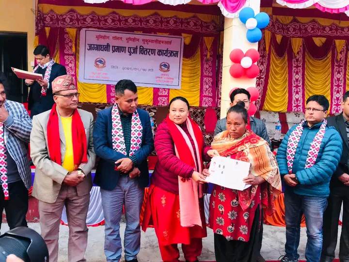 मकवानपुरको बागमती गाउँपालिकाका ३० जना भूमिहिन सुकुम्बासीलाई १७ पुसमा लालपुर्जा वितरण गरिएको छ । गाउँपालिकाले एक कार्यक्रमको आयोजना गरी वडा नम्बर ४ का २८ जना र ५ नम्बरका २ जना गरी ३० जना भूमिहिन सकुम्बासीलाई पुर्जा वितरण गरेको हो ।