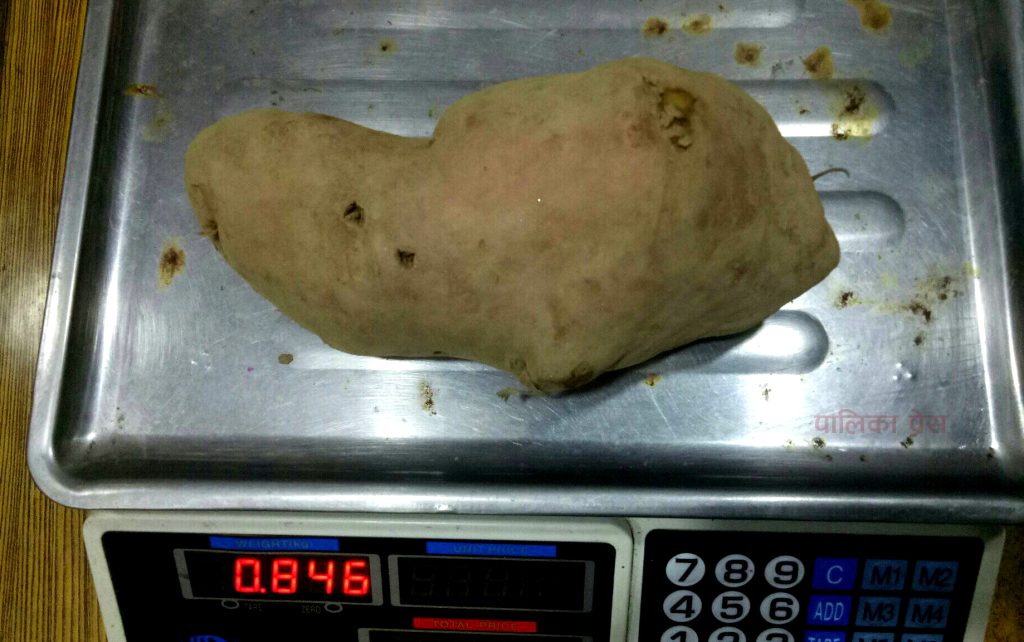 मकवानपुर थाहानगरमा एउटै आलु १ किलो बढि तौलको फलेको छ । थाहा नगरपालिका वडा नम्बर ७ चौबासका मान बहादुर थिङको बारीमा यसवर्ष एउटै आलु १ किलो ३० ग्रामको फलेको स्थानीय राम बहादुर थिङले जानकारी दिए । चौबास दलान टोलका थिङको बारीमा यसपालि आलु उत्पादन राम्रो भएको थिङले बताए ।