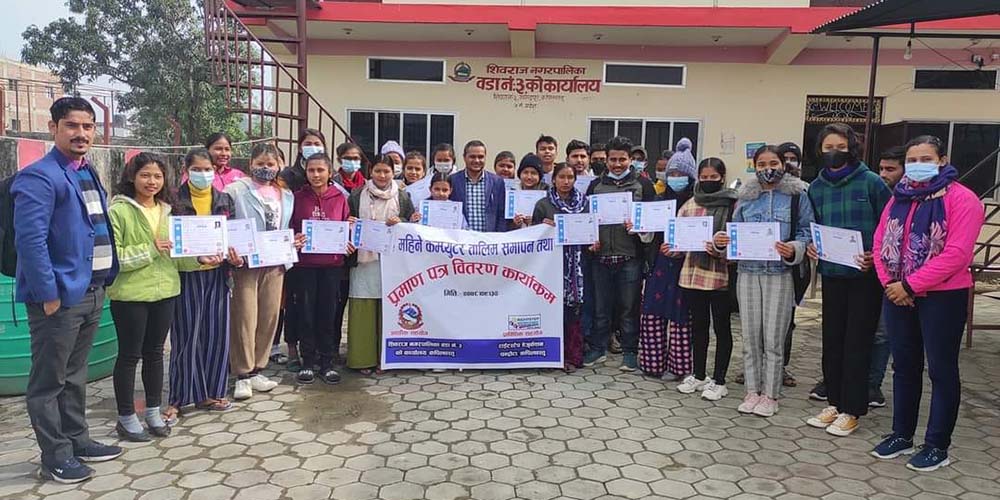 कपिलवस्तुको शिवराज नगरपालिका वडा नम्बर ३ मा आयोजित तीन महिने कम्प्युटर तालिम सम्पन्न भएको छ । शिवराज नगरपालिका वडा नम्बर ३ को सहयोग र राइटस्टेप एजुकेसन एकेडेमीको प्राविधिक सहयोगमा तालिम सञ्चालन भएको थियो ।