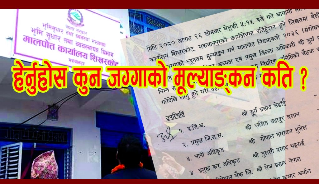 मालपोत कार्यालय शिखरकोट मकवानपुरको कार्यक्षेत्रमा पर्ने जग्गाहरुको घर जग्गा हस्तान्तारण प्रयोजनका लागि नयाँ मूल्याङ्कन दररेट निर्धारण सार्वजनिक गरिएको छ । नयाँ दररेट अनुसार आ.व. २०८०÷०८१ का लागि १ साउनदेखि लागू हुनेछ । प्रमुख जिल्ला अधिकारी सूर्य प्रसाद सेँढाइको अध्यक्षमा २६ असारमा बसेको न्यूनतम मूल्य निर्धारण समितिको बैठकले यो निर्णय गरेको हो ।