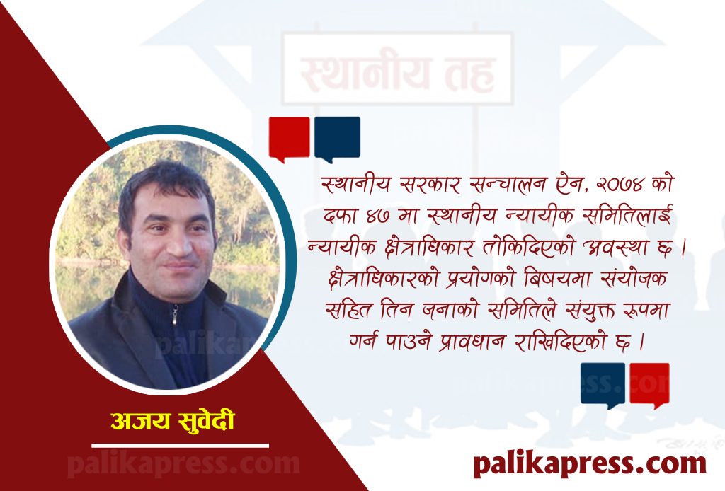 मानिसहरु स्थानीय न्यायिक क्षेत्राधिकार न्यायीक समितिको संयोजकले गर्ने भनेर चर्चा गरेको पाईन्छ तर यो चर्चा भने गलत हो क्षेत्राधिकारको प्रयोग समितिले गर्ने हो । अझ स्थानीय सरकार सन्चालन ऐनको कतिपय प्रावधानलाई हेर्नेहो भने स्थानीय तहको न्यायीक अधिकार प्रमुख प्रशासकिय अधिकृत र पालिका प्रमुखले समेत गर्न पाउछन् । जुन देहाय बमोजिम रहेको छ ।