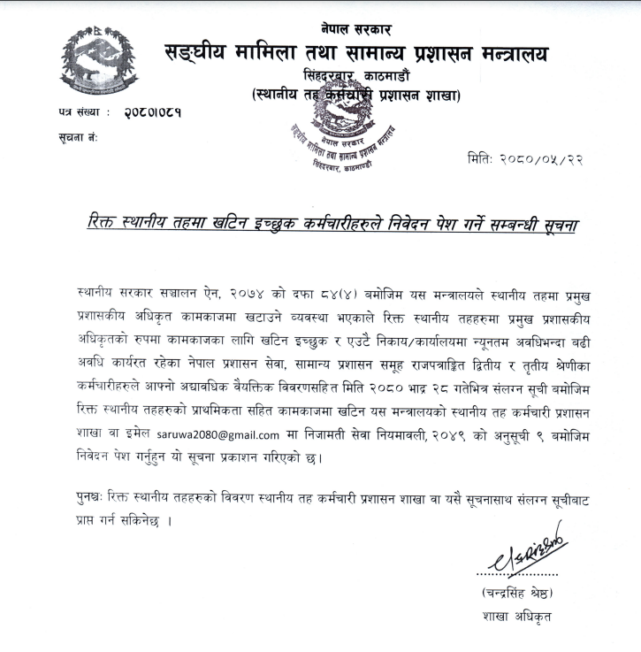 मन्त्रालयले देशभरका रिक्त स्थानीय तहको सूची उपलव्ध गराउँदै ऐनअनुसार कुनै स्थानीय तहमा न्युनतम अवधि व्यतित गरेका अधिकृतहरुलाई आफु सरुवा हुन चाहेको स्थानीय तहको प्राथमिकता क्रमसहित आगामी २८ भदौभित्र निवेदन दिन भनेको छ ।