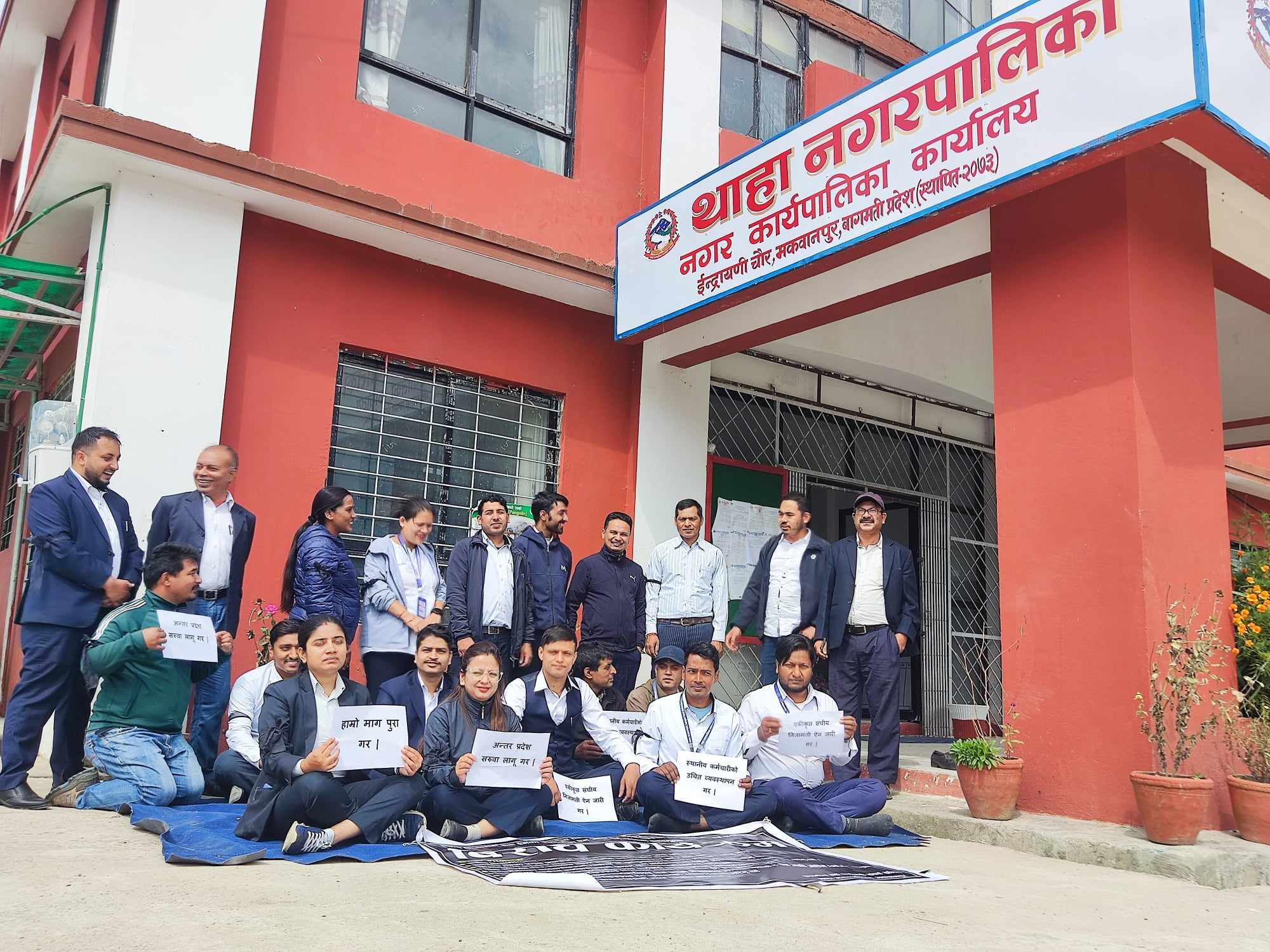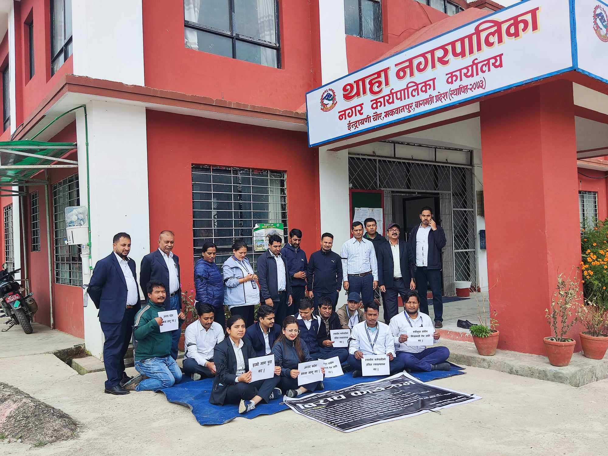 कर्मचारीहरुले नगरपालिका अगाडि कालो व्यानरमा आफ्नो मागहरु राखेर केहिबेर शान्तीपुर्ण प्रदर्शन गरेका थिए । स्थानीय तहमा कार्यरत कर्मचारीहरुकोे विषयलाई मन्त्रीपरिषदबाट पारित निजामती विधेकमा नसकेटिएको बताउँदै कर्मचारीहरु सिहदरवार केन्द्रित आन्दोलन गर्दै आएका छन् । उनीहरु ८ दिनदेखि काठमाण्डौको माइतीघर मण्डलामा सडक आन्दोलन गर्दै आएका छन् ।
