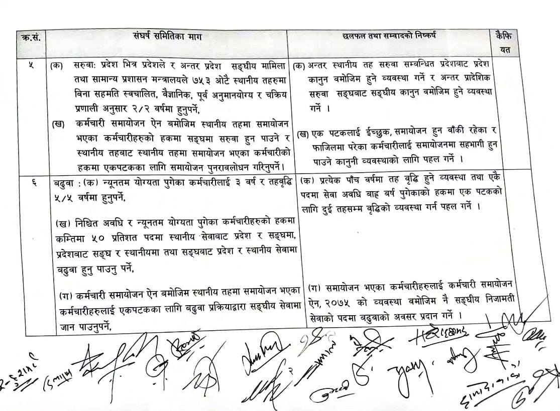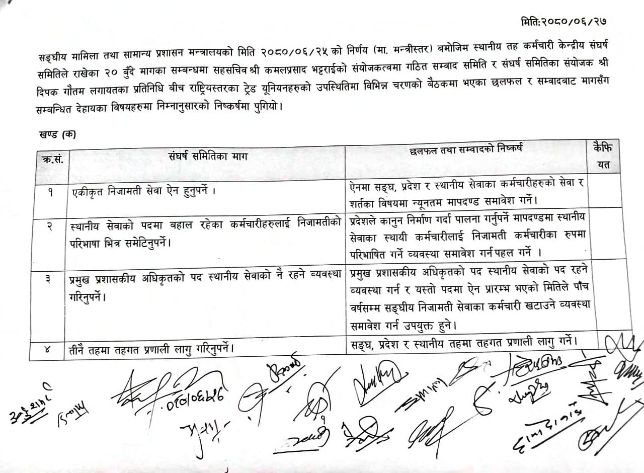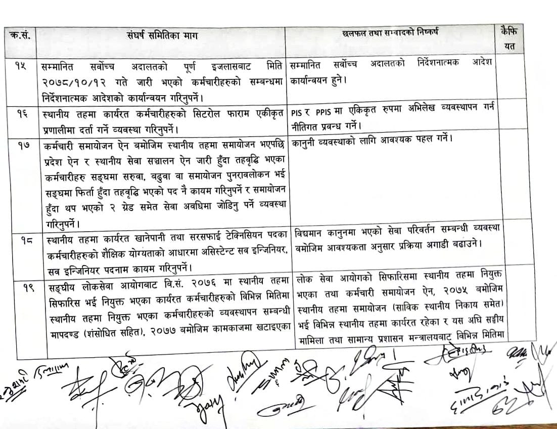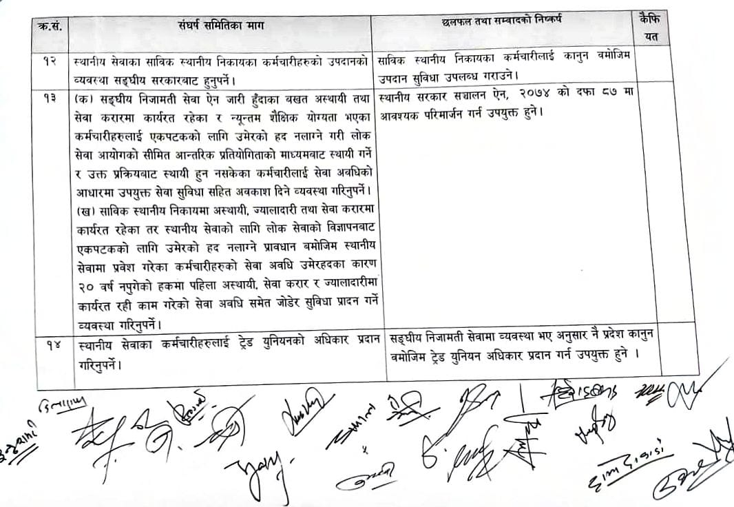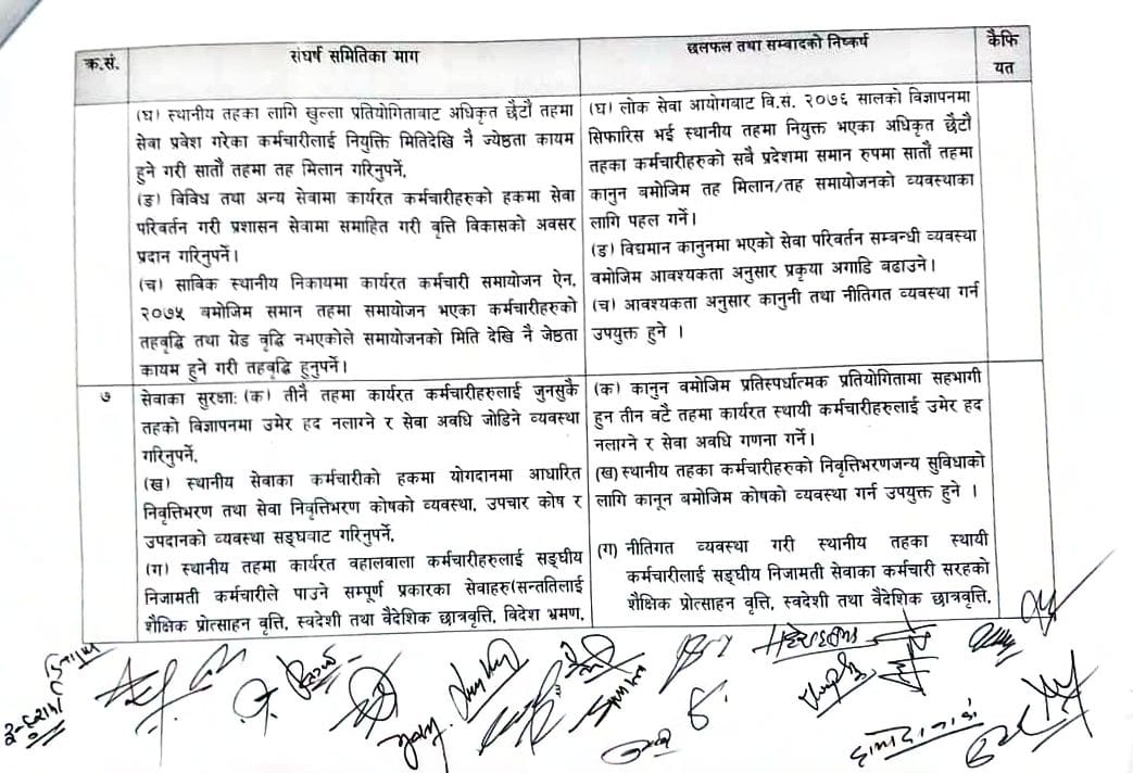 सरकार र आन्दोलनरत स्थानीय तहका कर्मचारीबीच १९ बुँदे सहमति भएको छ । विभिन्न विभिन्न २० बुँदे माग राखेर आन्दोलनमा उत्रिएका स्थानीय तहका कर्मचारीसँग चरण चरणमा भएको वार्ता पछि उनीहरुले उठाएका अधिकांश माग संघीय निजामती तथा प्रदेश निजामती सेवा ऐनमा समेट्ने सहमति भएको हो ।