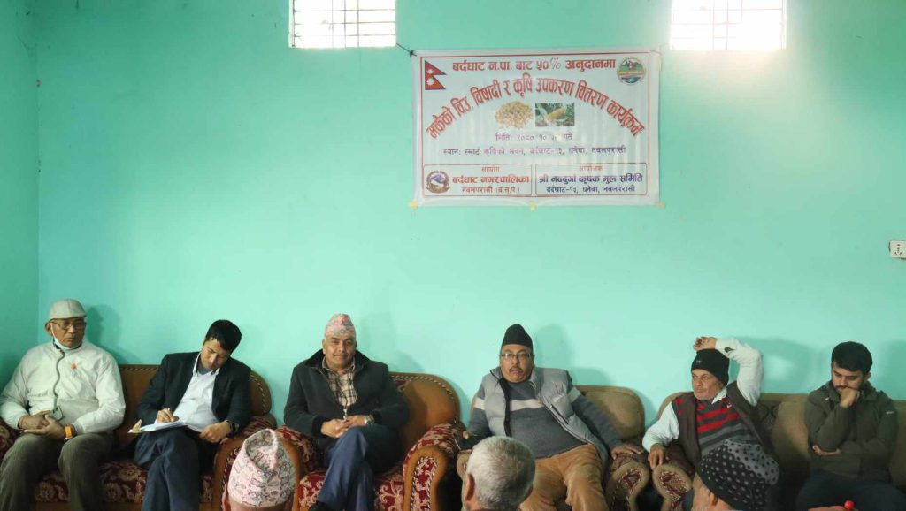 नवलपरासी बर्दघाट सुस्ता पश्चिम जिल्लाको बर्दघाट नगरपालिकाको सहयोगमा किसानहरुका लागि मकैको बिउ, विषादी र कृषि उपकरण वितरण कार्यक्रम भएको छ । नगरपालिकाले ५० प्रतिशत अनुदानमा श्री नवदुर्गा कृषक मूल समितिमा आवद्ध ३२ वटा कृषक समूहलाई विउ, विषादी तथा कृषि उपकरण वितरण गरिएको गरेको हो ।