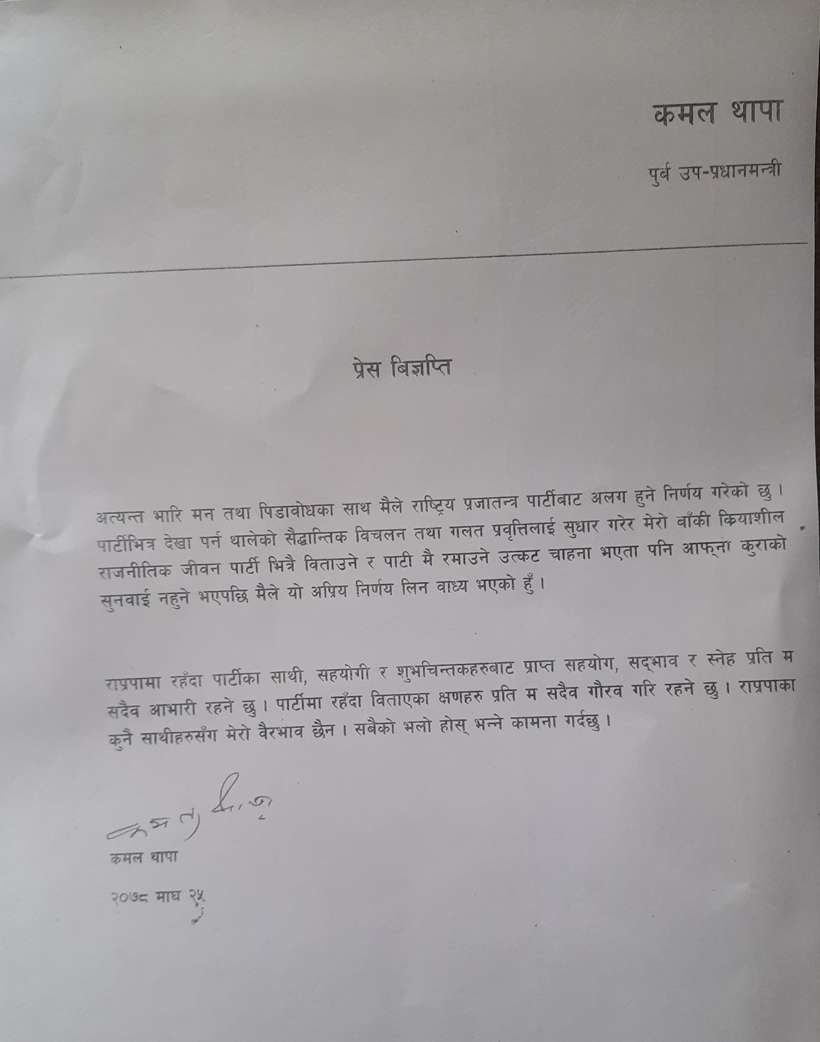 राष्ट्रिय प्रजातान्त्र पाटी (राप्रपा) का निवर्तमान अध्यक्ष कमल थापाले राप्रपाबाट अलग हुने घोषणा गरेका छन् । मंगलबार गृहनगर हेटौंडामा सञ्चारकर्मीसँग कुरा गर्दै पाटीबाट अलग हुने घोषण गरेका हुन् ।