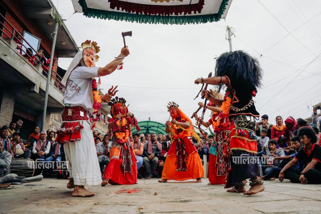 नाच्दा नाच्दा थकाइ लागेपछि देउताले जलको रुपमा रक्सी खान्छन्, अण्डा पनि खान्छन् । अन्तिममा एउटा बोका काटिन्छ । सबै देवीले त्यही एउटा बोकाको भोग पालैपालो खान्छन् । बोका भैरवले काट्छन्, सुरुमा गणेशले भोग खान्छन् । त्यसपछि सबै देवीले पालैपालो भोग खान्छन् । भोग खान लागेपछि देवीले बोका छोड्दै छोड्दैनन् । ८–१० जनाले बोका तान्नुपर्छ र त्यति नै जनाले देउता समाएर तान्नुपर्छ । अनि मात्रै भोग छुटाउन सकिन्छ ।