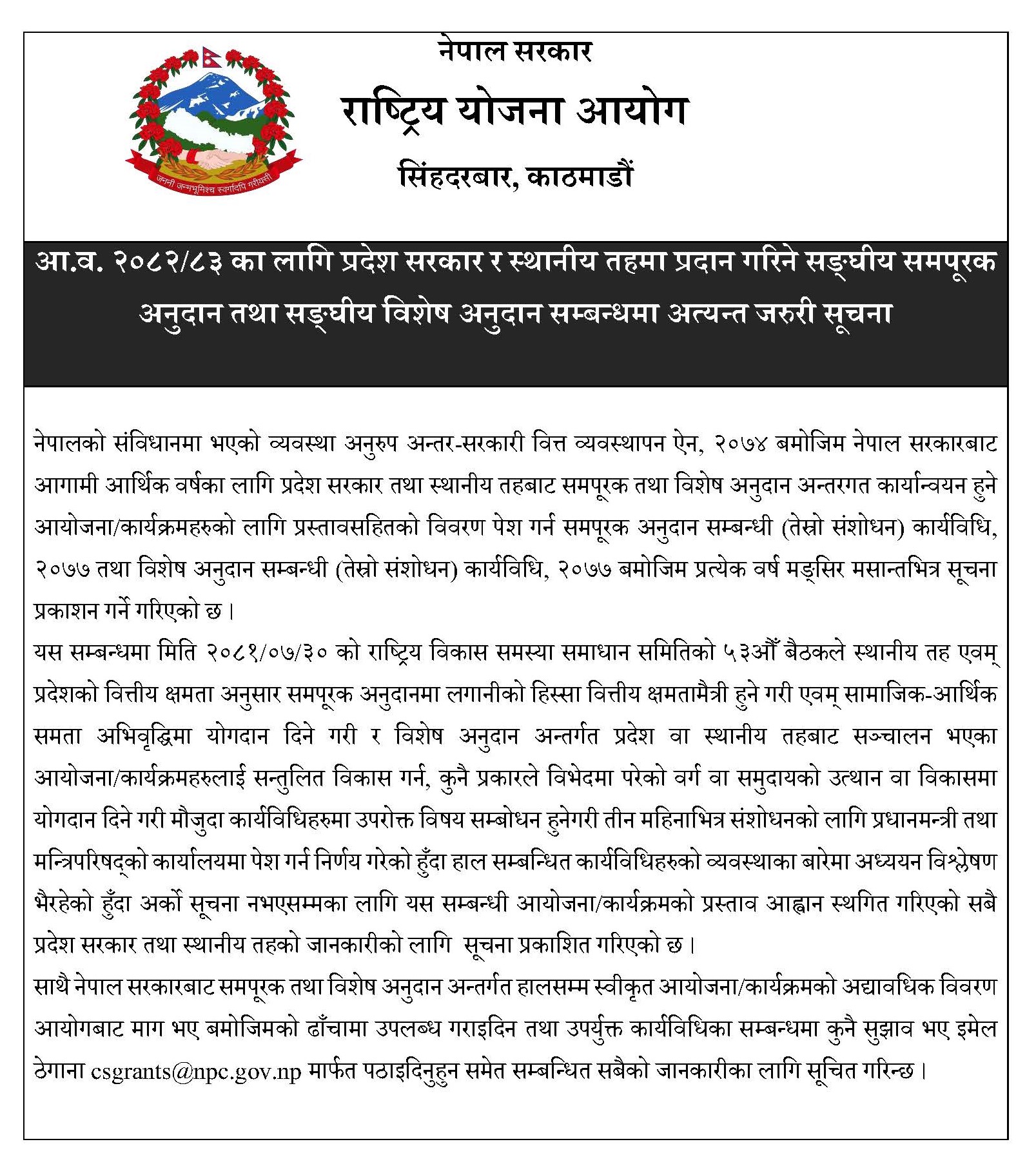 अन्तरसरकारी वित्त व्यवस्थापन ऐन २०७४ अनुसार अनुसार हरेक वर्ष समपूरक अनुदान र विशेष अनुदान अन्तर्गत कार्यान्वयन हुने आयोजना/कार्यक्रमका लागि प्रस्तावसहितको विवरण पेस गर्न मंसिर मसान्तभित्र सूचना प्रकाशित गर्ने गरिएको छ ।