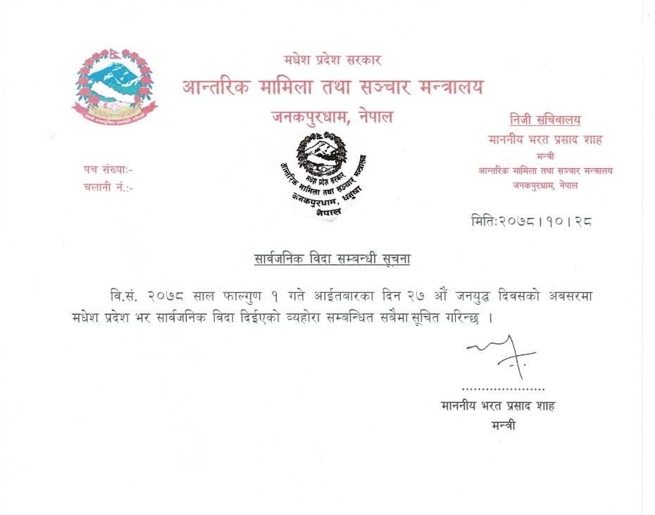 आगामी फागुन १ गते परेको जनयुद्ध दिवसको अवसरमा प्रदेश सरकारले सार्वजनिक विदाको समेत घोषणा गरेको छ। आन्तरिक मामिला तथा सञ्चार मन्त्रालयले शुक्रबार साँझ एक विज्ञप्ति जारी गरी फागुन १ गते आइतबार सार्वजनिक विदा दिएको जानकारी गराएको छ। आन्तरिक मामिला तथा सञ्चारमन्त्री भरत प्रसाद साहले विज्ञप्ति जारी गर्दै जनयुद्ध दिवसको अवसरमा आइतबार मधेश प्रदेशमा सार्वजनिक विदा दिएको जानकारी गराएका हुन्।