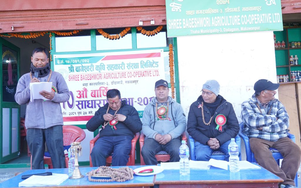 मकवानपुर थाहा नगरपालिकाको वडा नम्बर ३ मा रहेको बागेश्वरी कृषि सहकारी संस्थाको १०औं वार्षिक साधारणसभा भएको छ। थाहा नगरपालिका वडा नम्बर ३ का वडा अध्यक्ष हिरेन्द्र कुमार रायमाझीको प्रमुख आतिथ्यतामा सभा भएको हो । संस्थाको कार्यालय डाँडागाउँमा भएको साधारणसभामा थाहा नगरपालिका कृषि शाखा प्रमुख संजय तिवारीको विशिष्ट आतिथ्यता रहेको थियो।