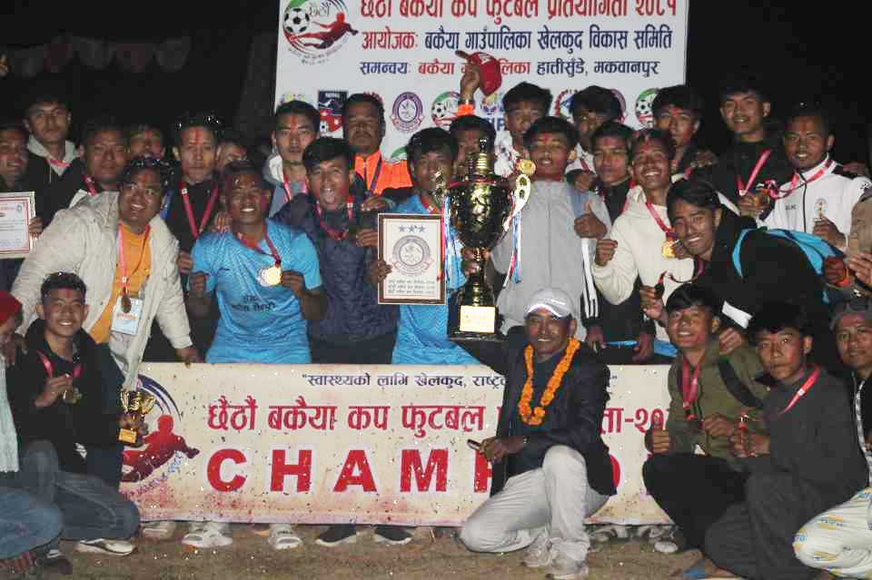 बकैया गोल्डकप प्रतियोगिताको फाइनल खेल सकिएको छ । छैठौं संस्करणको यस प्रतियोगितामा सिनियरतर्फ ३ नम्बर वडा र जुनियरतर्फ ११ नम्बर वडाले उपाधि चुमेको छ । बकैया गाउँपालिका वडा नम्बर ३ हात्तीसुडेस्थित बकैया रंगशालामा १ माघमा भएको फाइनल खेलमा वडा नम्बर ९ लाई ५–० गोलले हराउँदै ३ नम्बरले प्रतियोगिताको उपाधी जितेको हो । ३ नम्बरको जितमा आयुष नेगीले ह्याट्रिक गरे । यस्तै अन्जन गोले र सुजन गुरुङले एक–एक गोल गरे ।