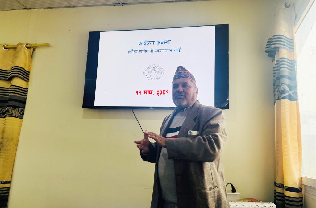 हेटौंडा खानेपानी व्यावस्थापन बोर्डको वर्तमान अवस्थाका विषयमा जानकारी मुलक अन्तरक्रिया कार्यक्रम हेटौंडामा गरिएको छ । हेटौंडा उपमहानगरपालिका नगर कार्यपालिकाकीृ प्रमुख मिना कुमारी लामा, बागमती प्रदेशको खानेपानी तथा सिंचाइ मन्त्रालयका सचिव मोहन कुमार शाक्य, मकवानपुरका प्रमुख जिल्ला अधिकारी तिर्थराज चिल्वाल, वडा अध्यक्षहरुलगायतका विभिन्न क्षेत्रका सरकोकारवालाहरु सहित अन्तरक्रिया गरिएको हो ।