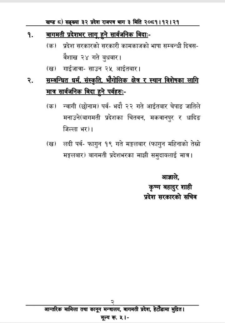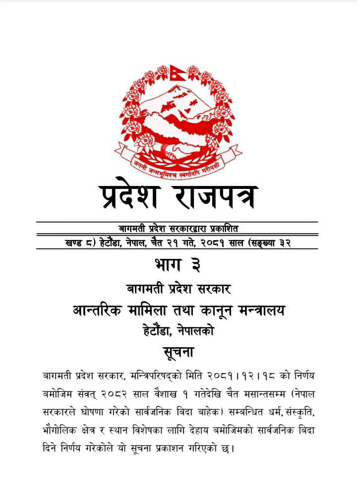 बागमती प्रदेश सरकारले २४ वैशाखमा सार्वजनिक बिदा दिएको छ । भाषा दिवसको अवसर पारेर उक्त दिन प्रदेश सरकारले सार्वजनिक बिदा दिएको हो ।