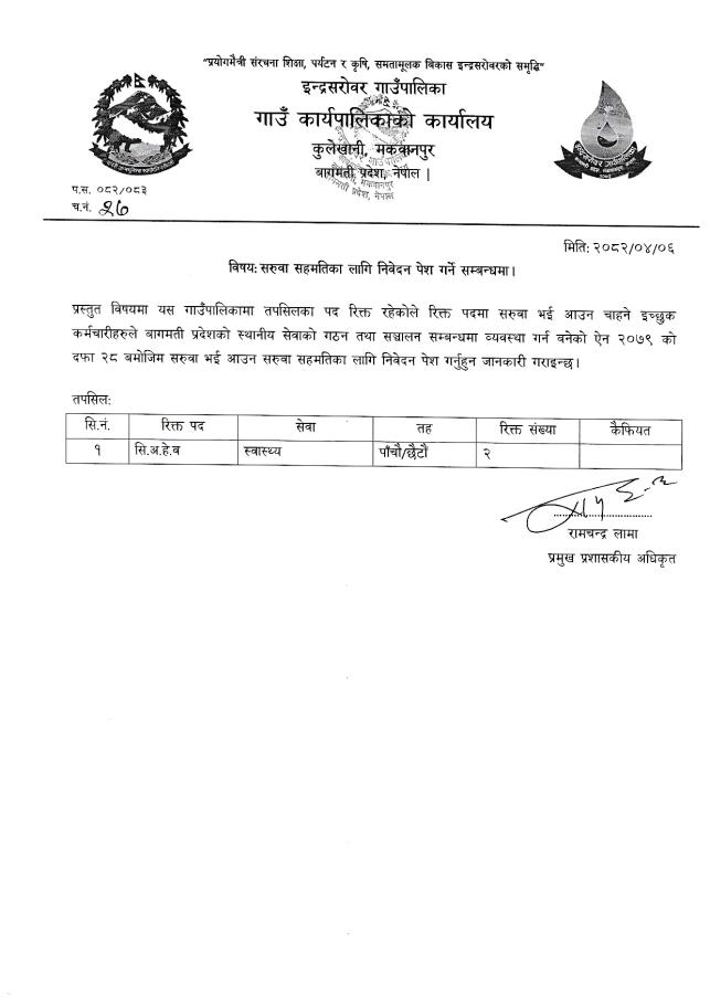 उक्त पदका लागि गाउँपालिकामा २ वटा पद रिक्त रहेको सूचनामा उल्लेख छ । इच्छुक कर्मचारीले बागमती प्रदेशको स्थानीय सेवा गठन तथा सञ्चालन सम्बन्धमा व्यवस्थ ागर्न बनेको ऐन, २०७९ को दफा २८ बमोजिम पालिकामा आउन सकिने उल्लेख छ ।