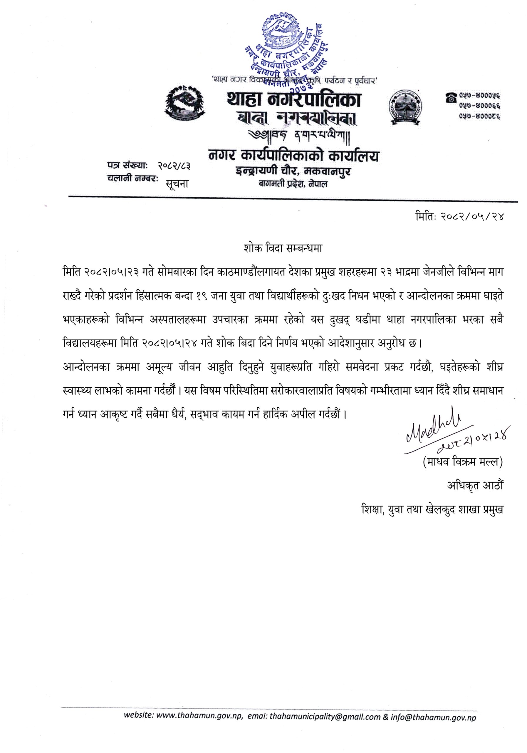 २३ भाद्रमा जेनजीले गरेको प्रदर्शन हिंसात्मक बन्दा देशभर १९ जनाले ज्यान गुमाएका छन् भने करिब ४ सय घाइते भएका छन् । विभिन्न ठाउँमा भइरहेको प्रदर्शनले शिक्षा क्षेत्रमा समेत प्रत्यक्ष असर पारेपछि विद्यालय बन्द गर्ने निर्णय गरिएको नगरपालिकाले जनाएको छ । थाहा नगरपालिकाले यस विषम परिस्थितिमा विद्यार्थी, शिक्षक, अभिभावक र सम्पूर्ण नगरवासीलाई शान्त वातावरण कायम गर्न आग्रह गरेको छ । साथै परिस्थितिलाई संवेदनशील ढंगले समाधान गर्न सबै पक्षलाई आग्रह समेत गरेको छ ।