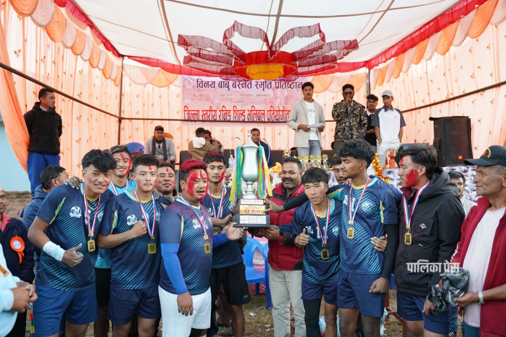 उपविजेता आयोजक विनयबाबु प्रतिष्ठानका खेलाडीहरु साथमा अतिथीहरु । फोटो श्रीकृष्ण श्रेष्ठ/पालिका प्रेस