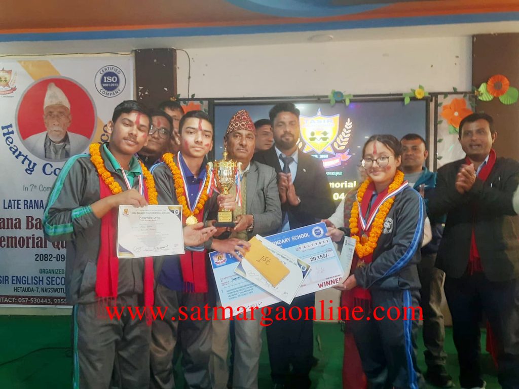 हेटौँडा–७ स्थित तासिर इङ्लिस सेकेन्डरी विद्यालयका संस्थापक राजन थापाका पिता स्वर्गीय रणबहादुर थापाको वार्षिक पुण्यतिथिको अवसरमा आयोजित सातौँ रणबहादुर थापा स्मृति अन्तरविद्यालय हाजिरीजवाफ प्रतियोगिताको उपाधि ब्रह्मदिक एकेडेमीले जितेको छ ।