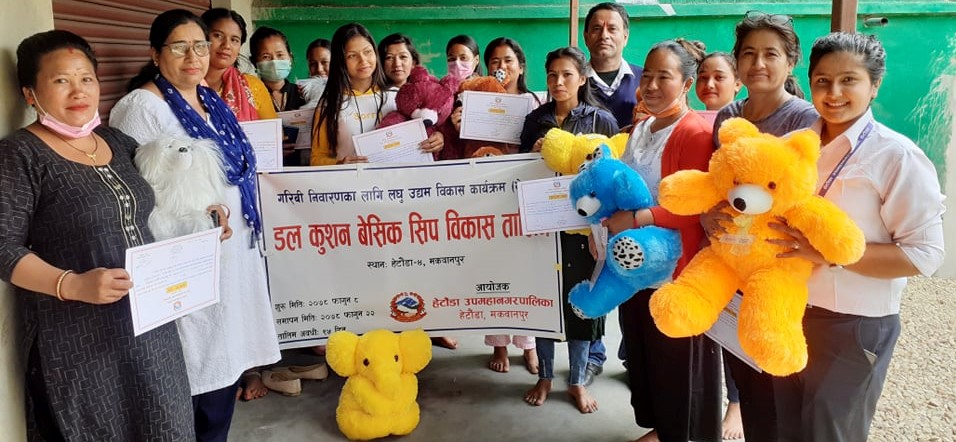 ११ जना महिलाका लागि १५ दिन सम्मको बेसीक तालिम दिइएको उपमहानगरपालिका आर्थिक विकास महासाखाका प्रमुख गंगा कुमारी चौलागाईले बताइन् । चौलागाईको प्रमुख आतिथ्यतामा तालिमको समापन गरिएको छ । तालिम लिएका महिलाहरुले आफुले डल र कुसन तयार पारेर बिक्री गर्न सक्ने छन् ।