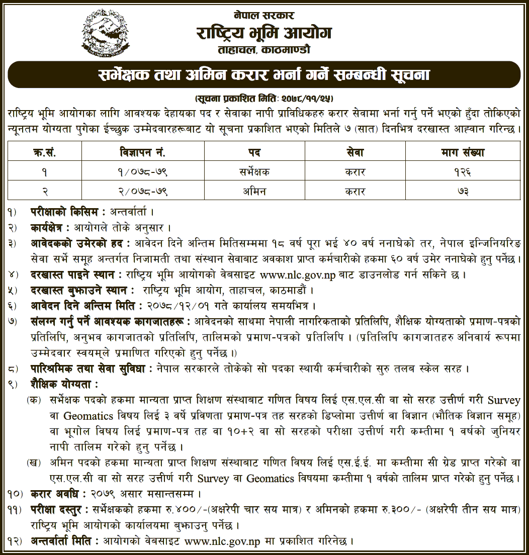राष्ट्रिय भूमि आयोगले ठूलो संख्यामा करारमा कर्मचारी माग गरेको छ । आयोगले सर्भेक्षक र अमिन पदमा ठूलो संख्यामा करार कर्मचारी माग गरेको हो । आयोगले सर्भेक्षक १२६ जना र अमिन ७३ जना गरी १९९ जना माग गरेको हो । आयोगले १८ बर्ष पूरा भई ४० बर्ष ननाघेका तर निजामती तथा संस्थान सेवाबाट अवकाश पाएका हकमा ६० बर्ष ननाघेकाले आवेदन दिन सक्ने सूचनामा जनाइएको छ ।