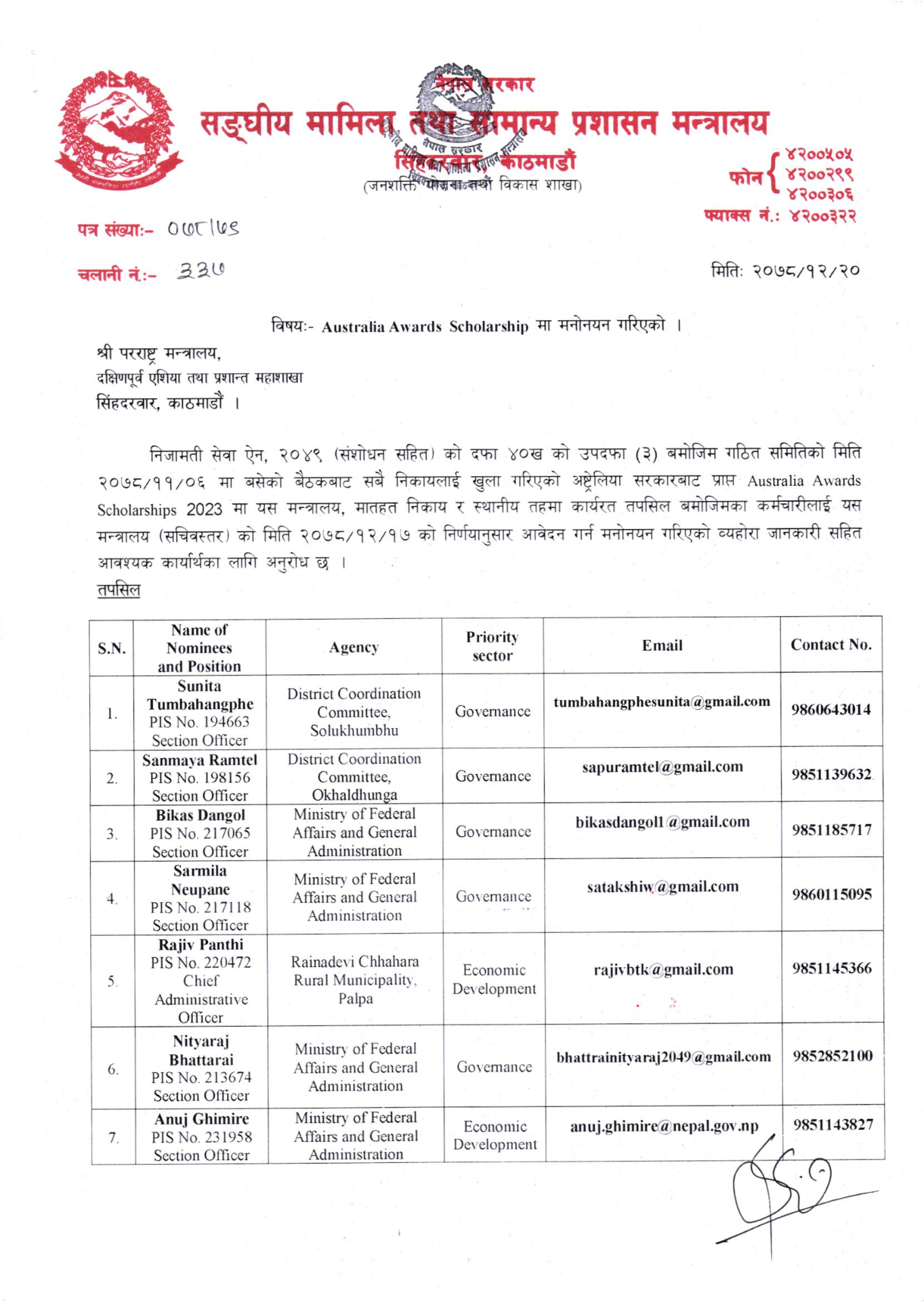 सामान्य प्रशासनका अनुसार अष्ट्रेलियन अवार्डका लागि दश जना कर्मचारीहरुलाई मनोनयन गरेको हो । छात्रबृत्तिमा मनोनयनमा परेकाहरुले २ बर्ष अष्ट्रेलियामा अध्ययन गर्न पाउनेछन् ।
