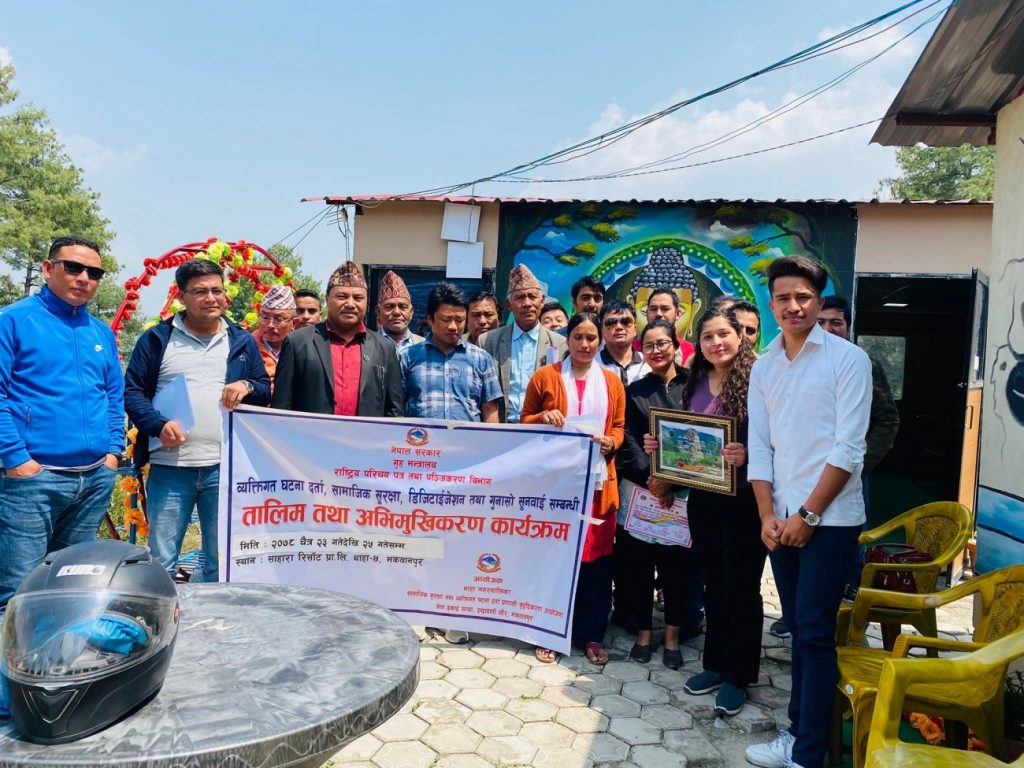 थाहा नगरपालिका वडा नम्बर ४ मा रहेको साहारा रिसोर्टमा संचालन भएको तालिमका सहभागीहरुलाई राष्ट्रिय परिचयपत्र तथा पञ्जीकरण विभागका एम.आइ.एस. सपोर्ट राजिव राई, दापासा शेर्पा र लुना खड्काले तीन दिनसम्म सहजीकरण गरेका थिए । तालिम समापनमा सहभागीहरुलाई प्रमाणपत्र र प्रशिक्षकहरुलाई मायाको चिनो प्रदान गरिएको थियो ।
