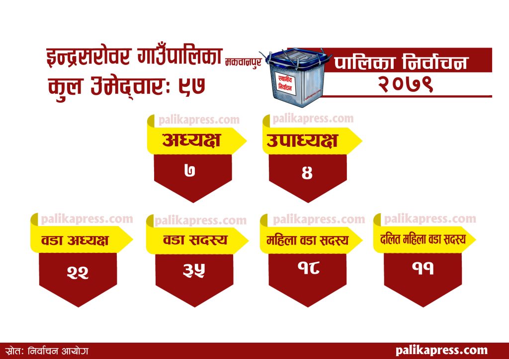 ५ वटा वडा रहेको इन्द्रसरोवरमा १ जना पालिका अध्यक्षका लागि ७ जना र १ पालिका उपाध्यक्षको लागि ४ जनाको उमेद्वारी परेको छ ।