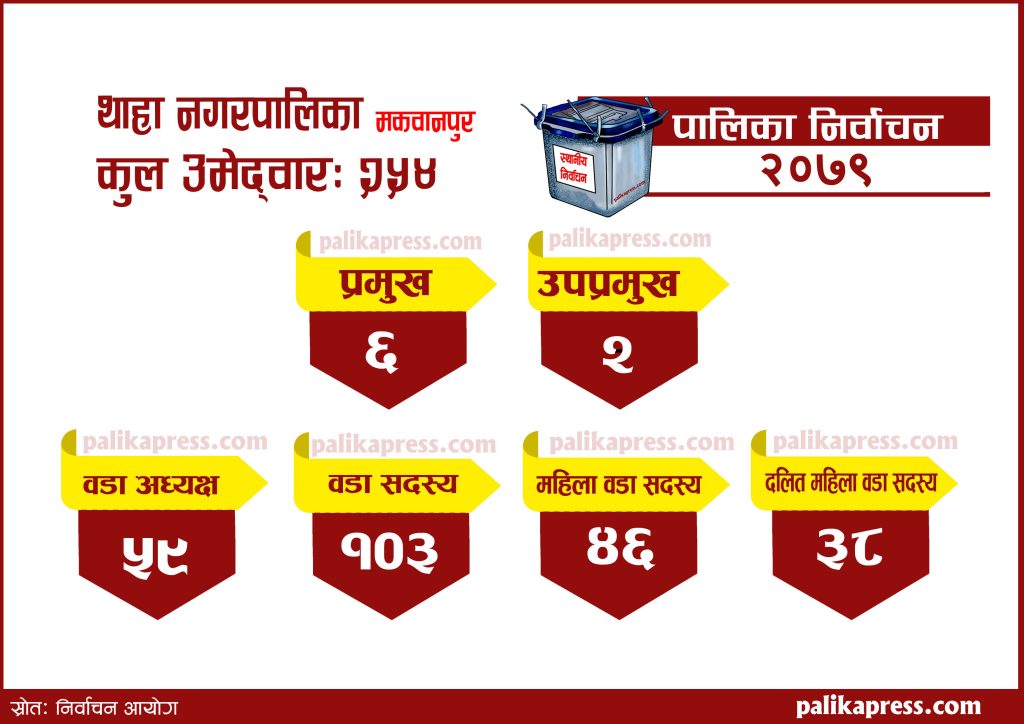 मकवानपुर थाहा नगरपालिकामा ६२ पदका लागि २४४ जनाको मनोनयन दर्ता भएको छ ।