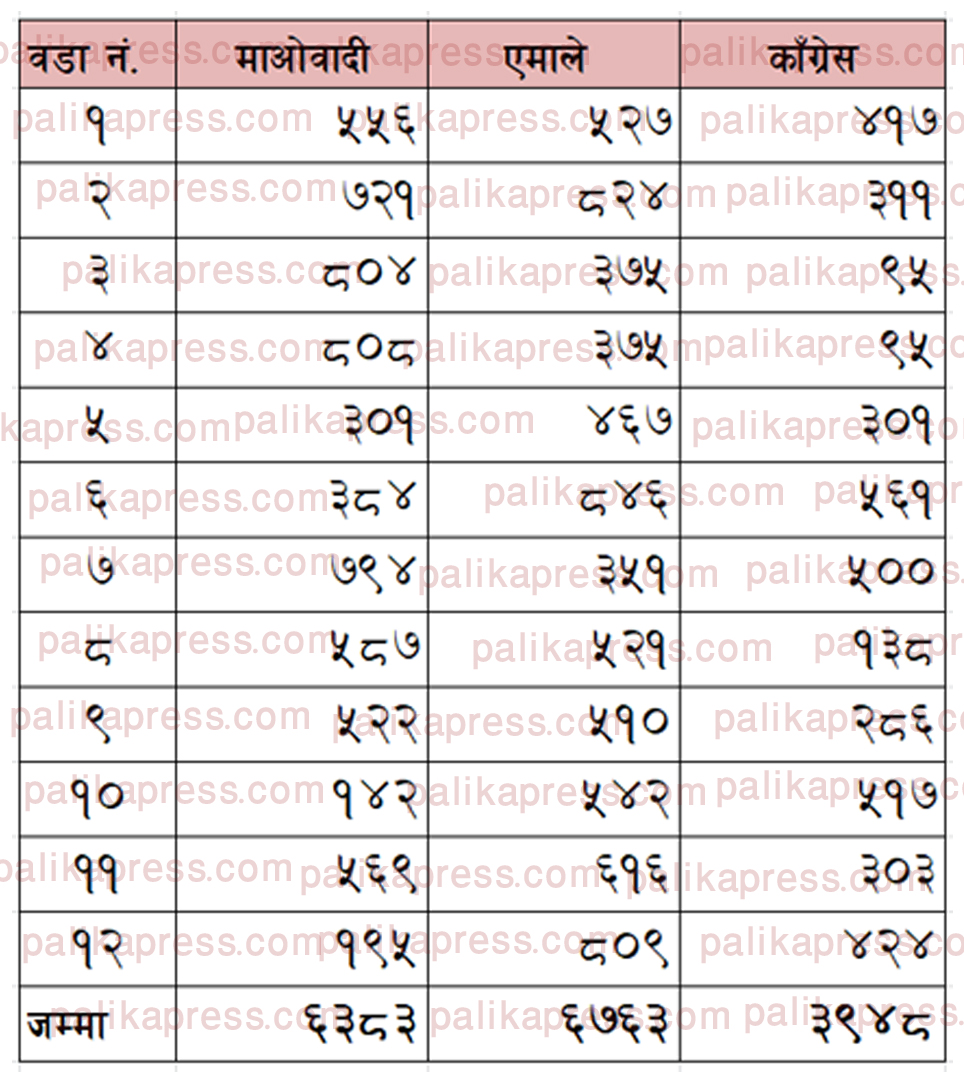तत्कालिन माओवादी केन्द्र र नेपाली काँग्रेसबीच चुनावी गठबन्धन भएको थाहामा ०७४ सालमा नेकपा माओवादी केन्द्रबाट ९ हजार ९१ मतसहित नगर प्रमुख र नेपाली काँग्रेसबाट ७ हजार ३०७ मतसहित उपप्रमुख विजयी भएका थिए । यस स्थानीय तह निर्वाचनमा पनि ति दुई दलबीच चुनावी तालमेल भएको छ ।