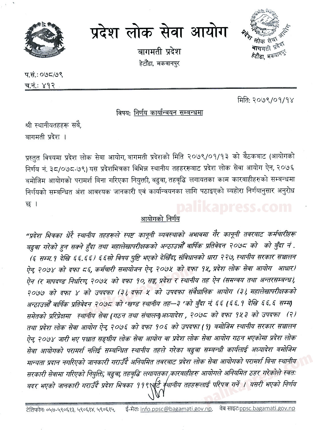 आयोगको १३ वैशाखमा बसेको बैठकले त्यस्ता सबै पालिकाहरुको निर्णय अनियमित तवरले गरेको ठहरसहित स्वतः बदर भएको जानकारी सहित बागमतीका ११९ वटै स्थानीय तहलाई परिपत्र गरेको छ । पालिकाहरुले आफूखुशी गरेको बढुवा, स्तरवृद्धि संविधानको धारा २२७, स्थानीय सरकार संचालन ऐन, २०७४ को दफा ८६, कर्मचारी समायोजन ऐन, २०७५ लगायतका कानुन विपरित भएकोले बदर गर्ने आयोगको निर्णय छ । बढुवा बदर गरिनूमा महालेखा परीक्षकको अन्ठाउन्नौ प्रतिवेदनलाई समेत आधार मानिएको छ ।