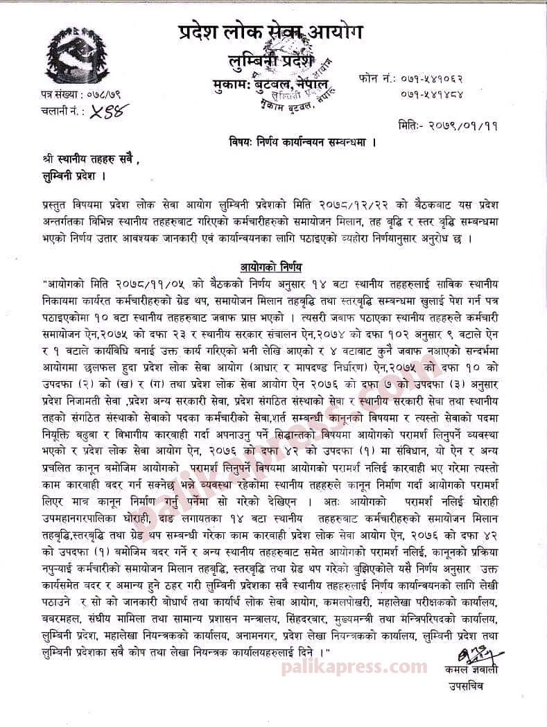 लुम्बिनी प्रदेश लोकसेवा आयोगले स्थानीय तहहरुले आयोगको परामर्श बिना गरिएको कर्मचारी नियुक्ति, बढुवा तहवृद्धि खारेज गर्न स्थानीय तहहरुलाई परिपत्र गरेको छ ।