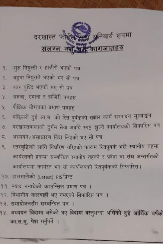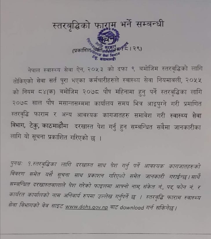 स्वास्थ्य सेवा विभागले स्तरवृद्धि हुन योग्यता पुगेका कर्मचारीहरुलाई आवेदन पेस गर्न सूचना सार्वजनिक गरेको छ।