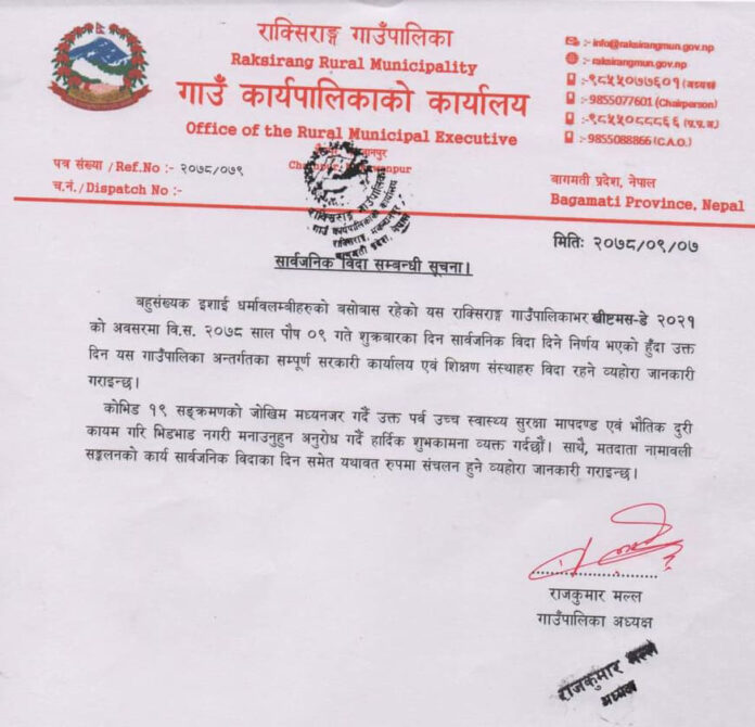 मकवानपुरको राक्सिराङ गाउँपालिकाले क्रिसमसको अवसरमा भन्दै क्रिसमसको अघिल्लो दिन नै विदा दिने निर्णय गरेको छ । यस वर्षको क्रिसमस पुस १० गते शनिबार परेको छ । गाउँपालिकाले भने पुस ९ गते शुक्रबार नै क्रिसमसको अवसरमा बिदा दिने निर्णय गरेको हो ।
