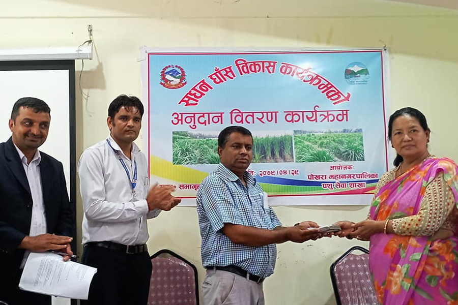 पोखरेलजस्तै सघन घाँस खेती गर्ने पोखरा महानगरभित्रका ९३ जना किसानले आइतबार महानगरबाट अनुदान पाएका छन् । ९३ जना किसानलाई महानगर उपप्रमुख मञ्जुदेवी गुरुङले १४ लाख ६५ हजार ५ सय ९० रुपैयाँ अनुदान वितरण गरेकी हुन् ।