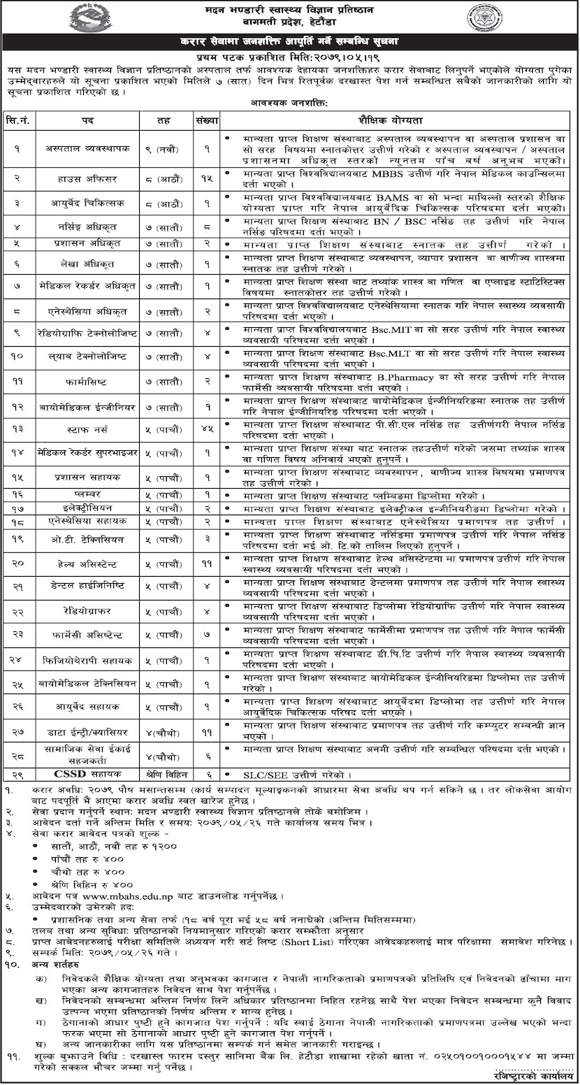 त्यसैगरी नर्सिङ्ग अधिकृत ८ जना, फार्मेसी असिस्टेन्ट ७ जना, सामाजिक सेवा ईकाइ सहजकर्ता र सिएसएसडी सहायक ६–६ जना, रेडियोग्राफि टेक्नोलोजिष्ट, ल्याब टेक्नोलोजिष्ट, डेन्टल आईजिनिष्ट र रेडियोग्राफर ४–४ जना, ओटी टेक्निसियन ३ जना माग गरेको छ । एनेस्थेसियन सहायक, इलेक्टीसियन, फार्मसिष्ट, एनेस्थेसिया अधिकृत र प्रशासनिक अधिकृत दुईदुई जना प्रतिष्ठानले माग गरेको छ ।